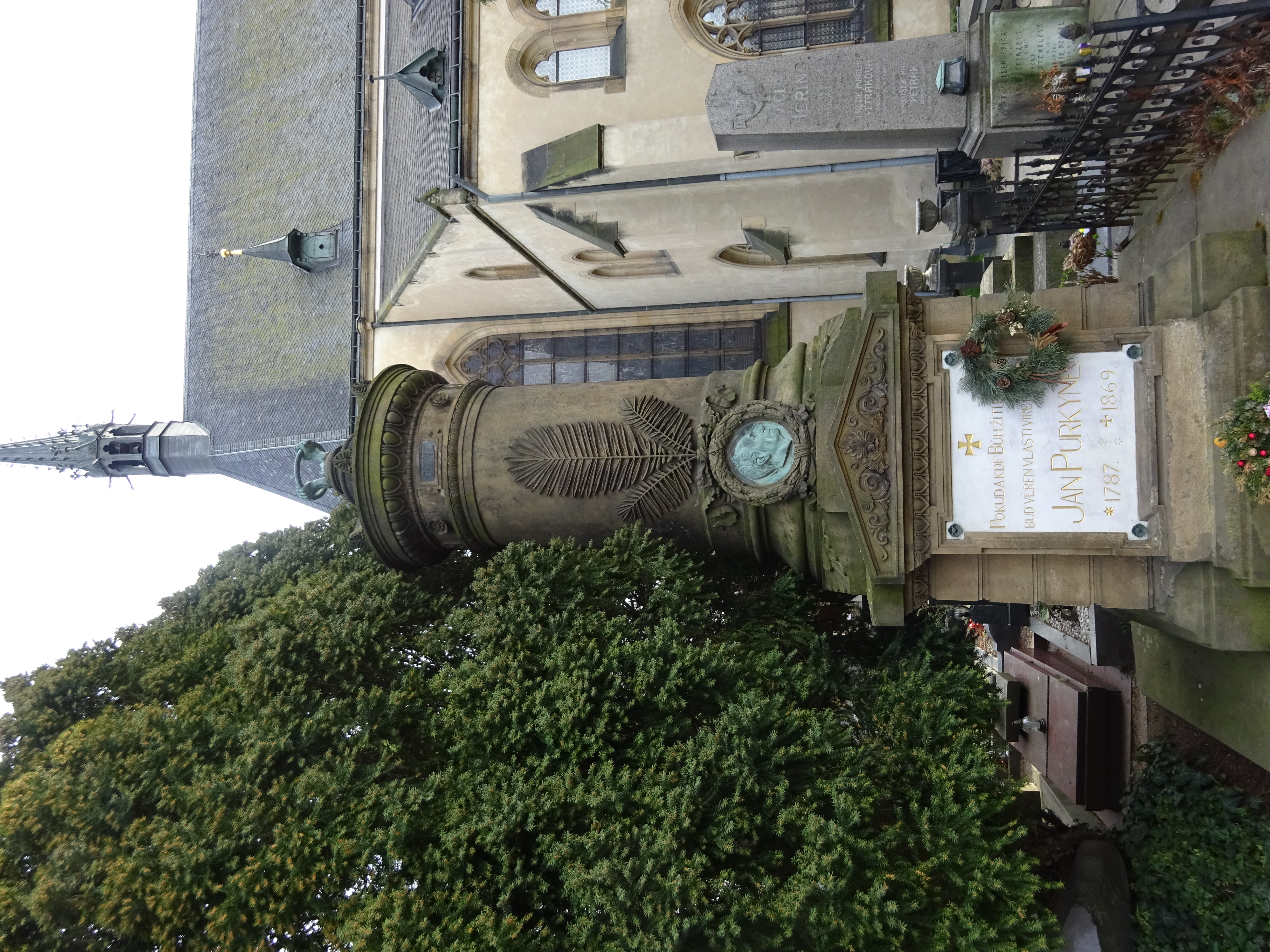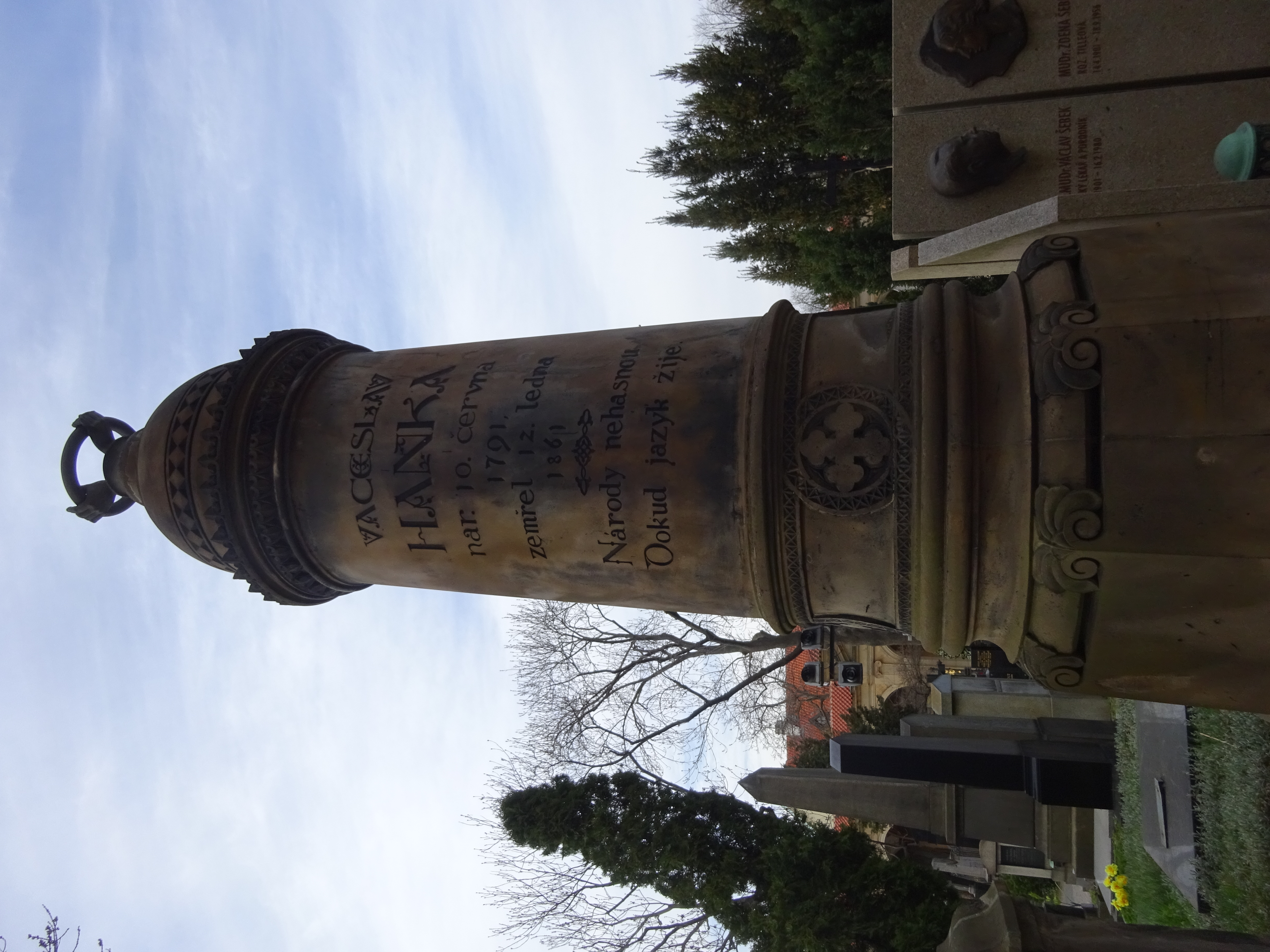 Jak jsem se tak po tom Slavíně motal, vzpomněl jsem si, že jsou tady hroby, na nichž se tyčí kolo svírané třema rukama. Jedná se o příslušníky spolku Svatobor, a ty tři ruce znamenají: Pomáhej! Osvěcuj! Pamatuj! Našel jsem dva. První patří Václavu Hankovi, který se proslavil či spíše neproslavil Rukopisem královedvorským, druhý patří Janu Evangelistu Purkyňovi.