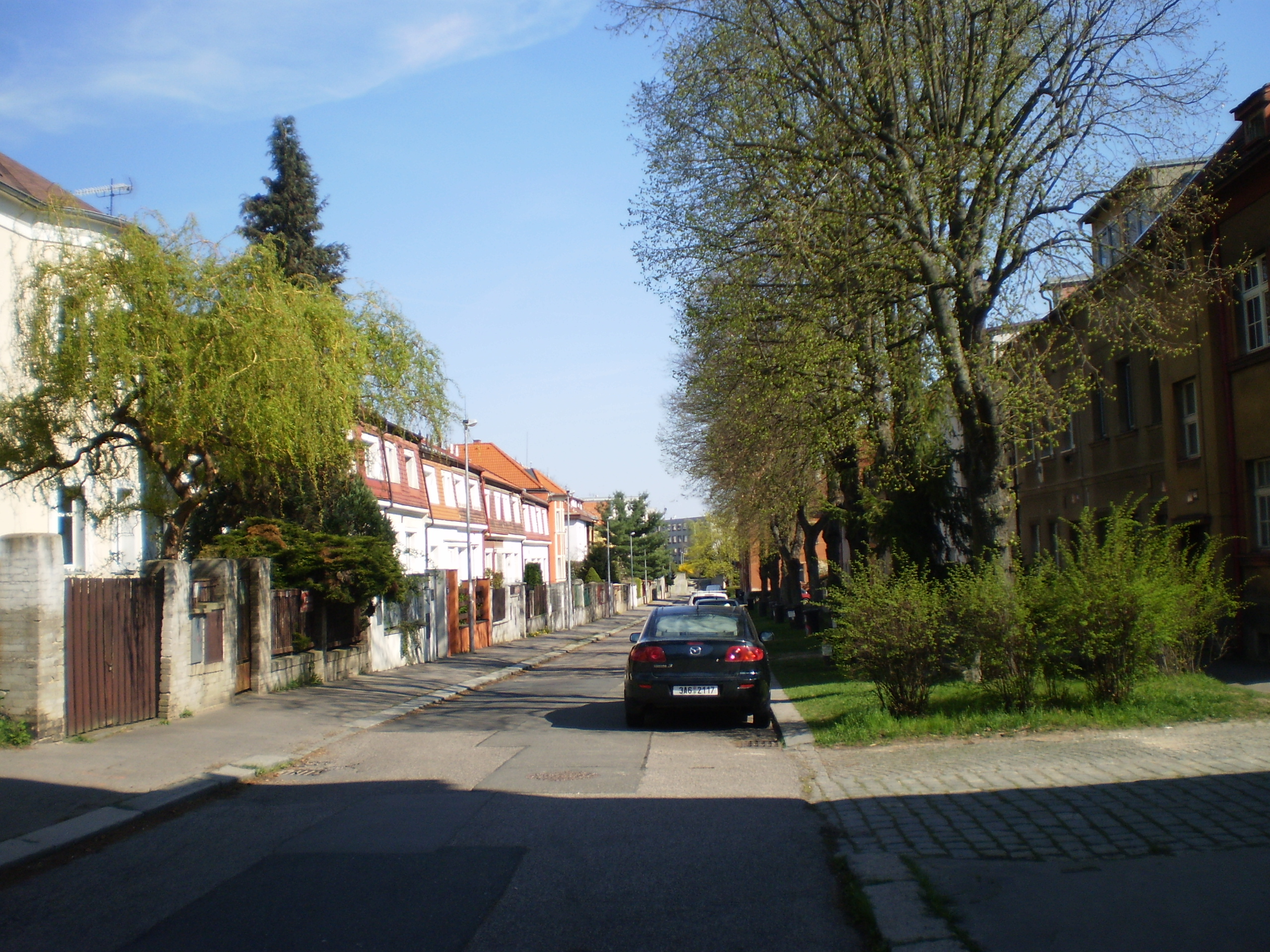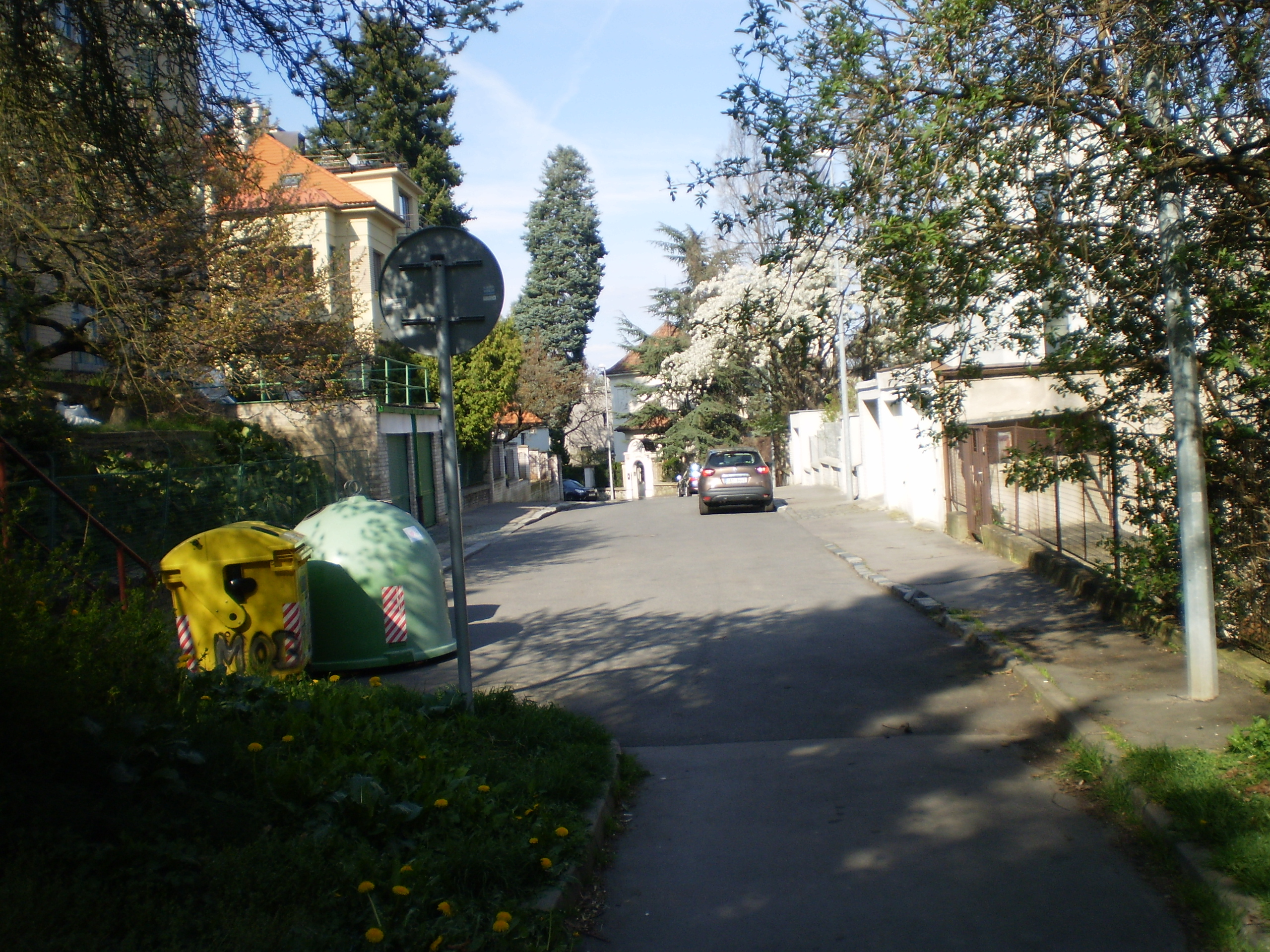 Netrvalo dlouho a sestoupil jsem až k centrále ČSOB u stanice metra Radlická (obr. 12). Hned za tou finanční centrálou jsou na kopci vidět další domečky (obr. 13), a ty už se skví na Smíchově. První ulici Smíchova, na kterou jsem vyšlapal, vidíte na obr. 14 a jmenuje se Na loužku (obr. 15).