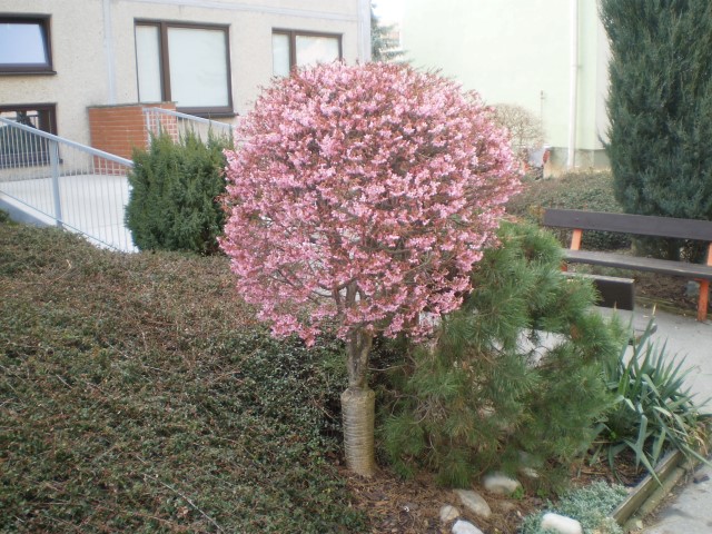 Počátek byl pěšmo, a když jsem procházel starým a malým jinonickým sídlištěm, spatřil jsem takový ministromeček bohatě opentlený nádhernými růžovými květy. Zřejmě nějaká exotická dřevina patrně ze subtropických krajů, kde si zvykla kvést tak brzy na jaře. Neváhal jsem a svým minifotoaparátem značky Olympus sejmul její otisk (viz miniobrázek vlevo, jehož maxiverzi spatříte, když si na něj kliknete, což platí i pro další dva obrázky).