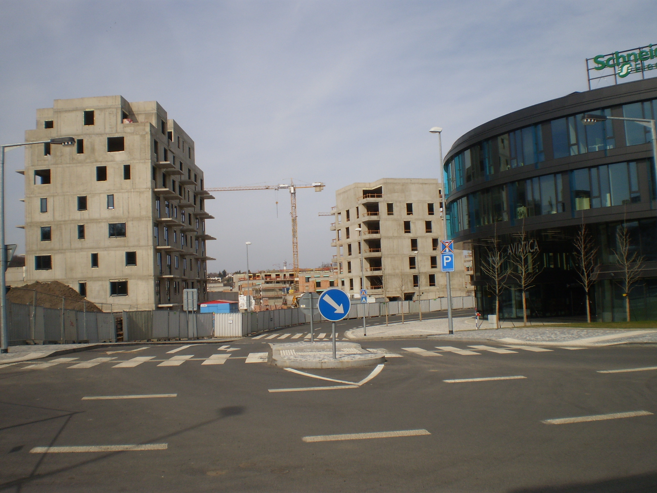 Aviatica je poměrně mohutná administrativní budova (Business Center) oválného půdorysu. Na dalším obrázku vlevo vidíte vpravo vchod do jejího atria a vlevo rozestavěné budovy nové pražské čtvrti. V Aviatice už sídlí celá řada firem, přízemí okupuje několik obchodů, ale jinak je tam zatím velmi skromný lidský provoz. To se však bezpochyby změní, až celá ta čtvrť definitivně obživne. Alespoň tak doufám, jelikož pak už mé pěší procházky tímto směrem do centra Prahy nebudou muset překonávat zuboženou pustinu.